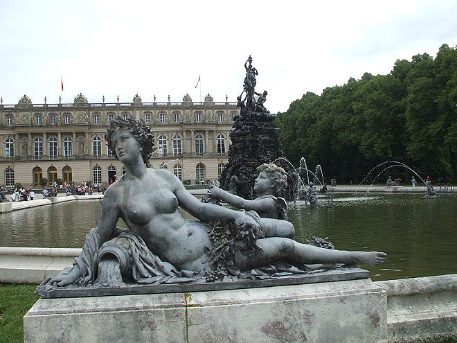 Brunnen, Skulpturen, Wasserspiele und die breite Front des Schlosses - prächtig !