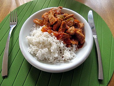Das Fleisch kurz abspülen und in nicht zu große Stücke schneiden. Die