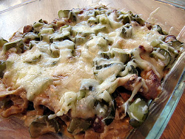 Fleischsoße geben, darauf die geschnittenen Gurken verteilen und alles mit