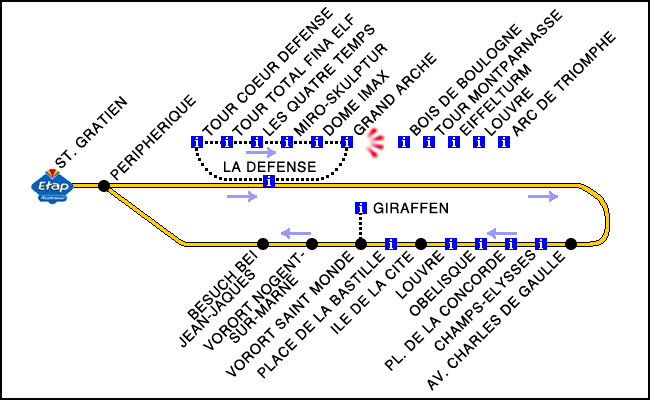schönste Sicht als Tourist in La Defense hat man aber wahrlich vom Dach des Grand Arche - das wollten sich beide ebenfalls auf keinen Fall entgehen lassen. Aus einer Höhe von 110 m schaut man direkt runter auf den großen Platz mit seinen Wasserspielen, Skulpturen und Menschen so groß wie Ameisen, welcher wiederum direkt von den Glasbetonbauten wie Tour Coeur Defense, Tour Total Fina Elf und Tour EDF überragt wird. Selbst die niedrigeren Gebäude des Kugelkinos Dome IMAX, der muschelartigen Konstruktion des Centre National des Industries Techniques (CNIT) und des Einkaufzentrums Les Quatre Temps passen durch ihre futuristische Bauweise in diese "Zukunftsstadt" - man kann das einfach nicht richtig in Worte fassen, man muß sie erlebt haben. |