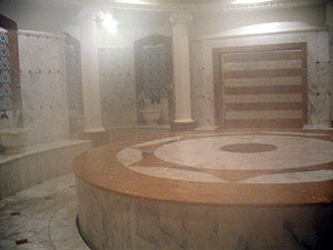 die Mitte des Raumes wird von einer kreisrunden, marmornen Liegefläche, dem