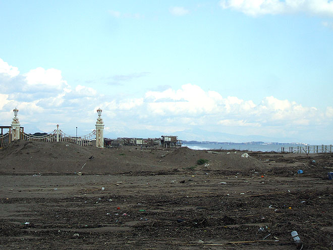 Dreckiger Strand im Vordergrund und die Zigeunersiedlung im Hintergrund