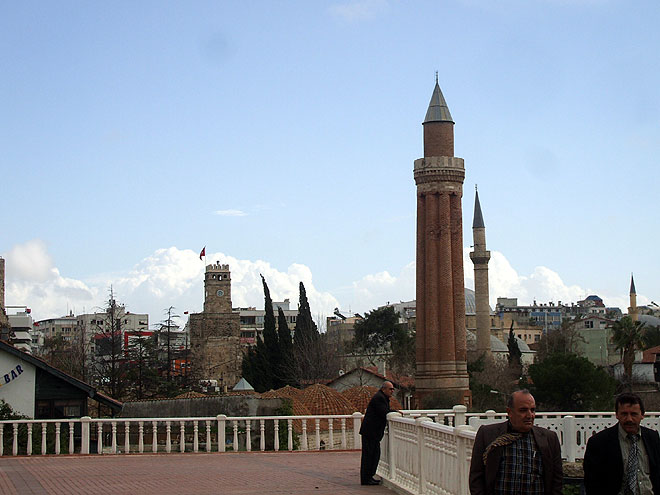 Wahrzeichen: Uhrturm (li) und das "gerillte Minarett" (re), dahiner die Moschee "Ulu Camii"