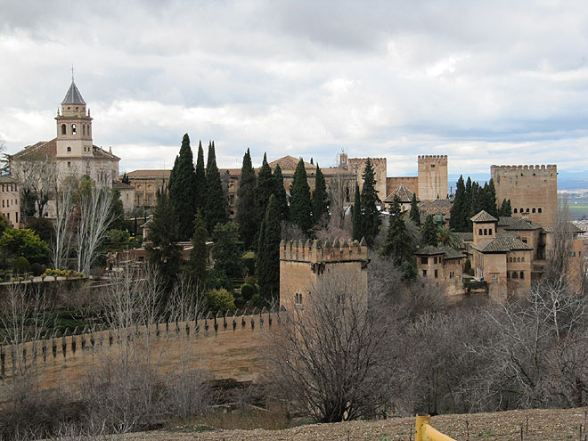 Blick von den Gärten der Generalife zur Alhambra (Forum = Mitte, Palast = rechts)