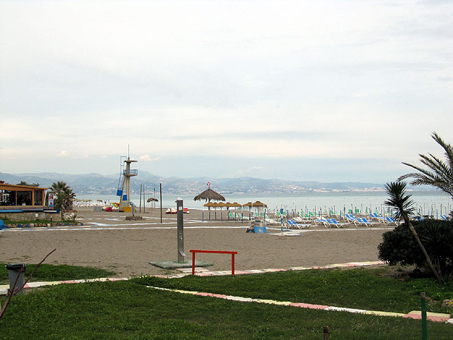 Ein Blick über den Strand nach Málaga und die schneebedeckten Berge im Hintergrund
