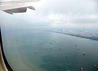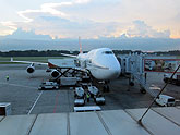 Singapur ein. Da alle Passagiere die Boing 747-400 verlassen müssen, schnappen wir uns die Miniaturausgaben der Zahnbürsten und Zahnpastatuben aus dem Qan- tas-Beutelchen und suchen das nächstgelegene WC im Terminal. Die Benut- zung einer "vernünftigen" Toilette, die Gelegenheit einer reinigenden Gesichts- wasch- und Zahnputzprozedur und die Möglichkeit die Beine zu vertreten, ist eine wirklich dankbare Abwechselung zum tristen Sitzen bei monotonem Triebwerksbrummen. |