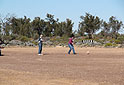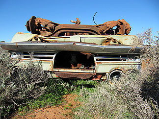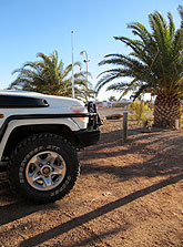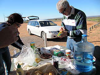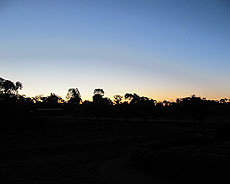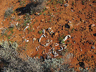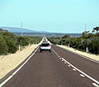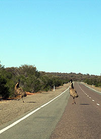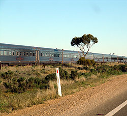 | Parallel zur Straße verlaufen Eisenbahnschienen und wir sehen so- gar einen Zug darauf fahren. An sich bestimmt nichts Besonderes, aber als Carsten das Schild mit einem roten Kamel an der Seite der Waggons lesen kann, klärt er uns über die Bedeutung dieses berühmten Gefährts der Eisenbahngeschichte auf. Es ist der legen- däre The Ghan, welcher seinen Namen den afghanischen Kamel- führern verdankt, die lange Zeit vor der Motorisierung für die Trans- porte ins Landesinnere verantwortlich waren. Der Fernverkehrszug heißt offiziell The Afghanistan Express und mit fast 3000 Strecken- kilometern zählt er zu den längsten Eisenbahnlinien der Welt. Der Zug durchquert seit 2004 in einer fast 50 Stunden dauernden Fahrt den ganzen australischen Kontinent in Nord-Süd-Richtung und ver- bindet damit die Küstenstädte Adelaide und Darwin, immerhin eine Reise durch vier Klimazonen und über 22,5 Breitengrade hinweg. | ![]() |