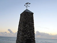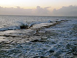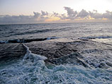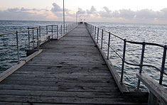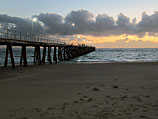 die Leinwand bringen könnten. Direkt vor der Jetty befindet sich ein weiteres Naturschauspiel, denn parallel zum Strand liegt eine Steinwand, die sich knapp unter der Wasseroberfläche erhebt. Dieser natürliche Wellenbrecher ragt bei Ebbe heraus (so z.B. derzeit bei Google Earth zu sehen) und wird bei Flut überspült. Als wir auf der Jetty stehen, kann das Wasser über die größten Teile des Felsenriffs gerade so drüberschwappen, aber an manchen Stellen brechen sich die Wellen zu einer meterhohen Gischt. Wir sitzen eine halbe Stunde einfach nur da und genießen den märchenhaften Sonnenuntergang bis es allmählich dunkel wird und wir den Heimweg antreten müssen. |