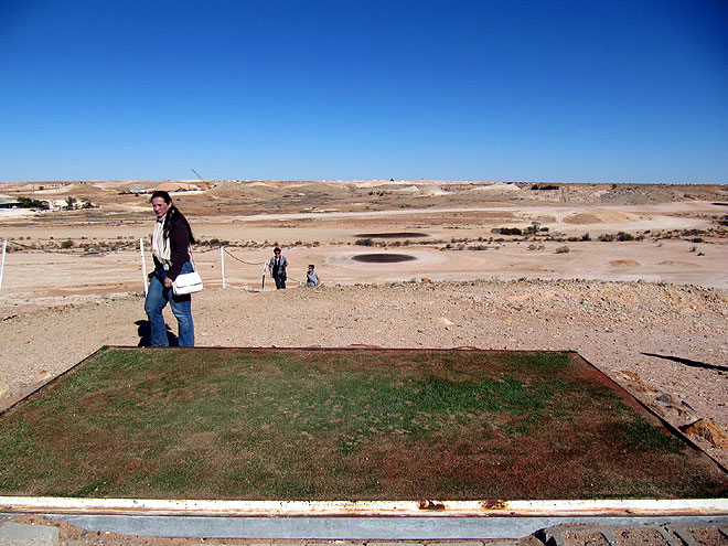Die Abschlagzone im Vordergrund und in der Mitte (dunkel & rund) das dazugehörige Loch
