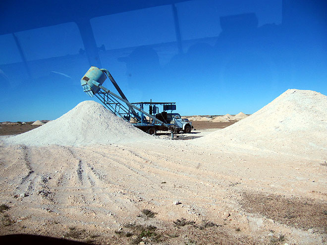 Mit dem Blower werden die Löcher ausgesaugt und auf dem Hügel nach Opalen gesucht