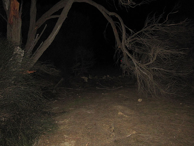 Mit dem Blitzlicht tasten wir uns zurück zum Auto - der rote Fleck ist das Rücklicht des Autos