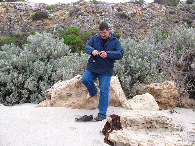 Carsten hat nicht aufgepaßt und eine Welle erreicht seinen Schuh - Wringen ist angesagt !