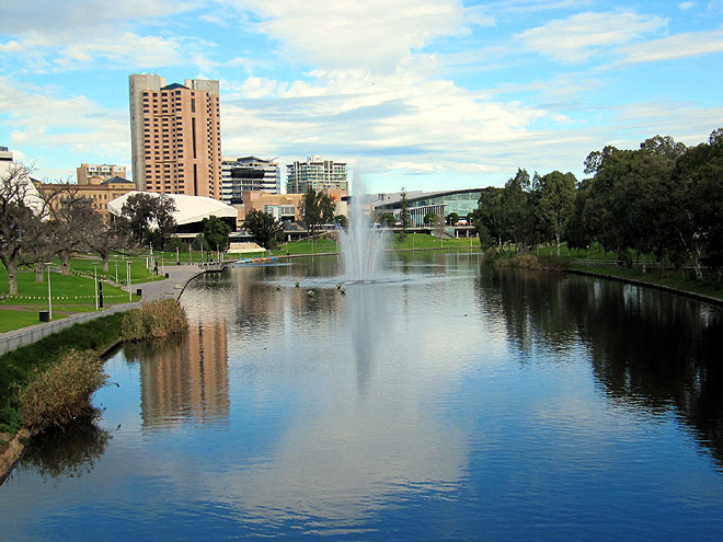 Der Fluß Torrens schlängelt sich zwischen North Adelaide (N) und der Innenstadt (S) durch