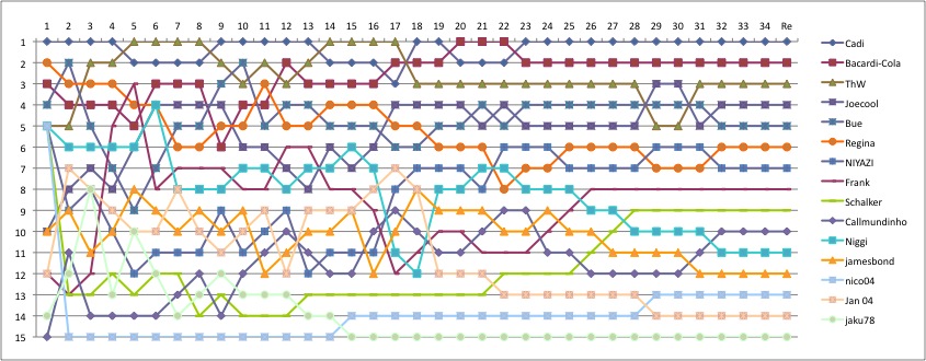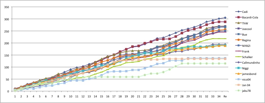 Mit der zweiten Grafik kann besonders gut erkennen, wer erstmal fleissig mitgetippt hat (gell, Jan ? ;) ) und wie sehr sich Lars und Cadi in der zweiten Saisonhälfte von den anderen absetzen konnten. Am Ende war Cadis Vorsprung aber doch nicht mehr in Gefahr, spannender waren die Plätze 3-5, dort haben ähnlich wie in der Bundesliga Thorsten und Walid sich ganz knapp vor Bü gehalten (das bedeutet Regeländerungen Freunde !! ;) ). Walid hat nach seinem Bombenjahr immer noch einen passablen 4. Platz geliefert. Damit bleibt auch wie im letzten Jahr für Bü ein undankbarer UEFA-Cup-Platz, das wars mit meinen Champions-League-Millionen ;) Erwähnenswert sind noch folgende Aspekte: -