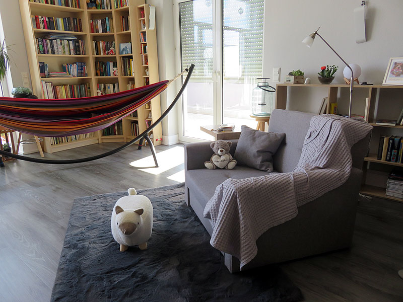 von Carsten: seit gestern ist Olgas Leseecke komplett ... 3,70 m hohe Bücherregale, ein Kuschelteppich,Lesesessel, schafige Fußablage (Lieferung gestern) und eine Leselampe.