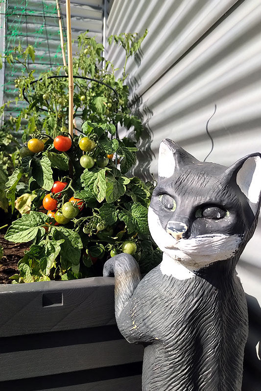 von Olga: unsere Katze Thommy bewacht die Tomaten auf dem Hochbeet - langsam bekommen auch sie endlich Farbe