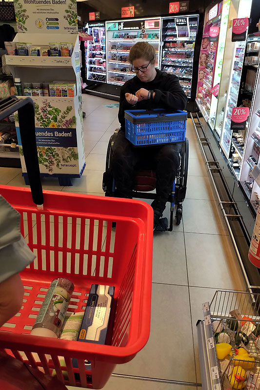 von Olga: nur 3 Minuten später als die Rückkehr bin ich mir dem Kind hier beim kleinen Drogerieeinkauf (zum Glück nur 2 Etagen unter uns)