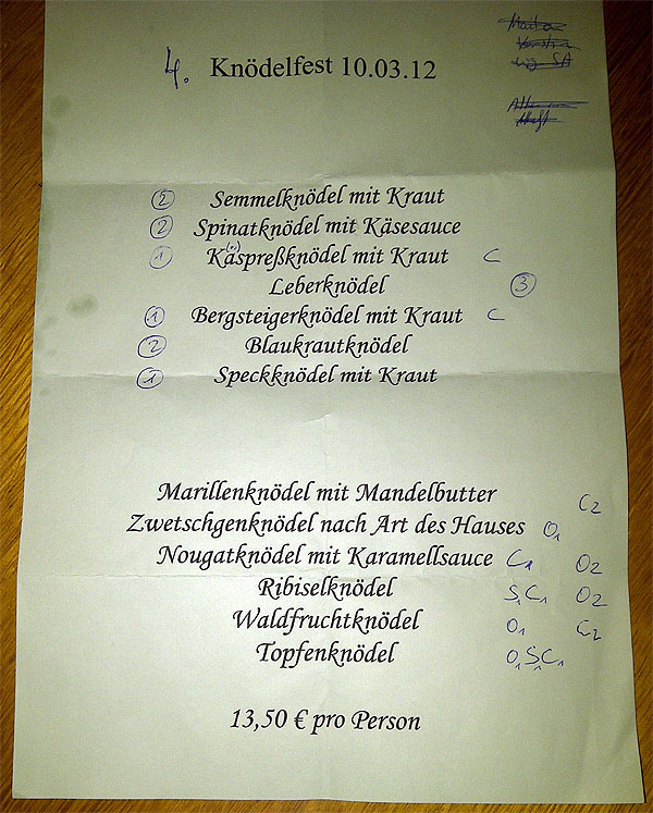 | 10.03.2012 | Durch Dresden-For-Friends sind die OLCAs auf das 4. Dresdner Knödelfest in der "Almhütte" aufmerksam geworden und eine solche Gelegenheit wollen sich Olga, Carsten und Stephanie nicht entgehen lassen. Zum einen locken natürlich leckere Knödelkreationen, wie z.B. Kaspreß-, Bergsteiger-, Speck-, Semmel-, Spinat-, Blaukraut-, Marillen-, Nougat-, Ribisel- und Topfenknödel, zum anderen bleibt aber auch zwischen 17 Uhr und 21 Uhr genug Zeit, um in entspannter Atmosphäre über Gott und die Welt, die Schule und das Leben und über die Zukunft zu reden. >>_Beweisfoto_<< |