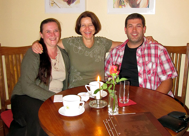 | 19.09.2012 | Nach über 11 Jahren Cyberfreundschaft via IDA bzw. OLCA-Liste können Olga und Carsten dem Gegenüber zum ersten Mal in Persona gegenüberstehen: Kati aus Ohio ist derzeit mit ihrer Mutter auf einer Schiffsreise von Potsdam bis Prag unterwegs und der Kahn macht heute für eine Nacht direkt unter dem Blauen Wunder in Dresden fest. Diese Gelegenheit wollen sich die drei natürlich nicht nehmen lassen und sie treffen sich wenigstens für zwei Stunden zum Kennenlernen und in die Arme schließen. >>_Beweisfoto_<< |