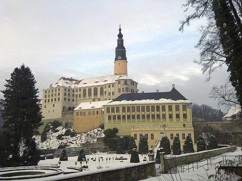 | 15.12.2012 | Begleitend zum kinderfreien Frühstück läuft die DVD "Der Mandant" (der Film mit Matthew McConaughey, Ryan Phillippe und Marisa Tomei in den Hauptrollen ist überraschend gut) und nach dem üblichen Wochenendgewusel in der Casa OLCA fahren Olga und Carsten am Nachmittag mit den Stötzners zum Schloß Weesenstein. Anna hatte Olga zum Geburtstag vier Karten für das Programm "Die Weihnachtswünsche des kleinen Nimmersatt" mit Josephine Hoppe als Vorleserin heiterer und besinnlicher Geschichten zur Weihnachtszeit und Dirk Ebersbach am Klavier geschenkt. Daß die Veranstaltung eine Art Kinder- & Familienprogramm ist, stört am Ende aber wirklich niemanden, denn so fühlen sich die Stötzners eben als Großeltern und die OLCAs als Eltern - nur die lieben Kinderlein fehlen. Neben der gelungenen Veranstaltung und dem halbstündigen Feueralarm aus dem Nachbarraum, wird aber immer ein wunderbares Bild im Gedächtnis bleiben: das märchenhaft verschneite Schloß Weesenstein. |