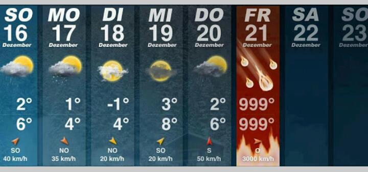 | 16.12.2012 | Eine gute Eigenschaft hat der ganze Weltuntergangs-Wahnsinn in 2012 ja, denn die angebliche Maya-Prophezeiung ist glücklicherweise nur befristet und wird uns nicht auch noch das ganze Jahr 2013 verfolgen. Auf Facebook kursieren ab heute schon die Wetteraussichten für den 21.12. :o) |