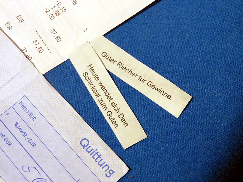 | 11.01.2015 | Seit 2013 sammelt Olga Erinnerungsstücke des laufenden Jahres in der Kiste "Die Wichtigkeit kleiner Dinge", die dann immer mit großer Spannung im Januar durchgesehen wird. Dieses Mal zeugen die ausgebreiteten Papierschnipsel von etlichen Igel-Touren, ein paar Abenden im "Odessa", den ersten Fahrten mit den Dresdner Verkehrsbetrieben, der tollen NRW-Woche, vom Hausverkauf, dem Umzug, dem Renovieren und verhältnismäßig vielen Theaterbesuchen. Besonders passend sind allerdings die Sprüche gewesen, die Olga und Carsten am Abend der Kaufvertragsunterzeichnung in ihren Glückskeksen vorfanden: "Guter Riecher für Gewinne" und "Heute wendet dich Dein Schicksal zum Guten". >>_Beweisfoto_1_<< & >>_Beweisfoto_2_<< & >>_Beweisfoto_3_<< |