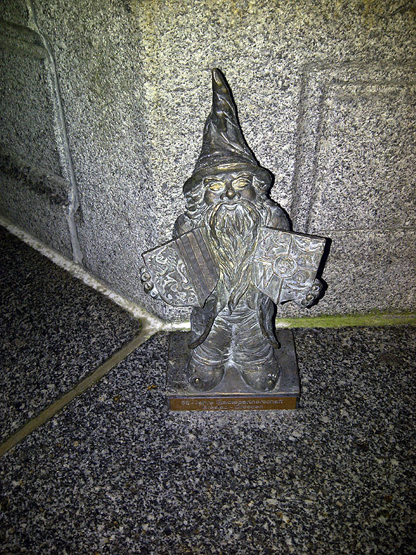 | 12.03.2015 | Olga hat vor drei Tagen mit einer kleinen Bemerkung den Ablauf des heutigen Abends beeinflußt, denn wenn sie schon Anfang der Woche berichtet, daß sie einen Heißhunger auf Schnitzel verspürt, kann der Weg nur unweigerlich in ein solches Restaurant führen. Statt "Schnizz" gehen die beiden aber diesmal zum "Schnitzelgarten" in der Weißen Gasse. Nach den Varianten "Hamburg mit Spiegelei" und "Försterin mit Pilzen" machen die beiden noch einen kleinen Rundgang um das Rathaus und begeben sich auf die Suche nach dem Breslauer Zwerg, welches im Februar 2015 als Geschenk der polnischen Partnerstadt übergeben wurde. Sie werden schließlich am Hietzigbrunnen bzw. Rathausbrunnen fündig. >>_Beweisfoto_<< |
