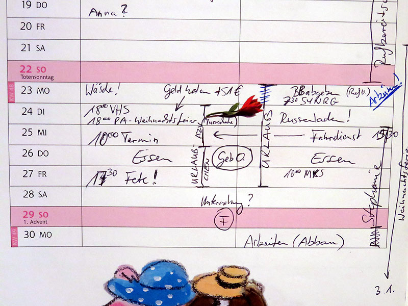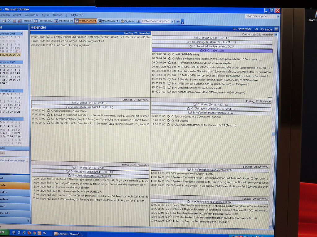 | 23.11.2015 | Für Olga und Carsten beginnt eine mit Terminen vollgestopfte Woche, denn ein Arbeitstag (heute), vier Urlaubstage, Olgas Geburtstag, die dazugehörige Feier mit Freunden, ein viertägiger Aufenthalt von Stephanie im Apartamento OLCA und ein ganztägiges Familientreffen zu viert anläßlich des Geburtstages benötigen gut koordinierte Vorbereitung, Planung und viel Zeit - zum Glück werden es alles sehr schöne Stunden ! Dagegen sieht der heutige Montag mit Arbeitsalltag, einer Wohnungsführung durch Stephanies neues Domizil via Skype und dem Zusammenlegen von Wäsche samt dem Gucken der DDR-Serie "Archiv des Todes" im Papierkalender und im elektronischen Pendant noch relativ harmlos aus. |